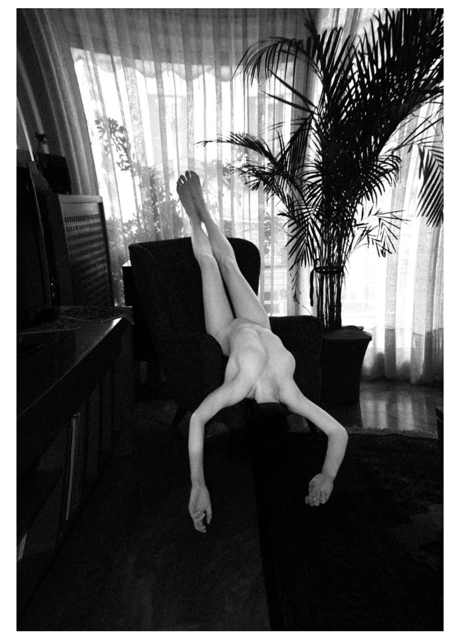 The photographic work Behind the eyelids attempts to upset the viewer by creating an otherwise everyday scene - a girl sitting in an armchair – by implicating unexpected elements which remain unexplained and trigger the viewer's interpretation. The nakedness of the body, the lack of the upper part of the head and the intense contrast between the white body and the dark background create the feeling of the uncanny. The inspiration for this project was the album of the same name (original title of the album "Mabuta no Ura") by the Japanese band Boris, a concept album for a fantastic film.