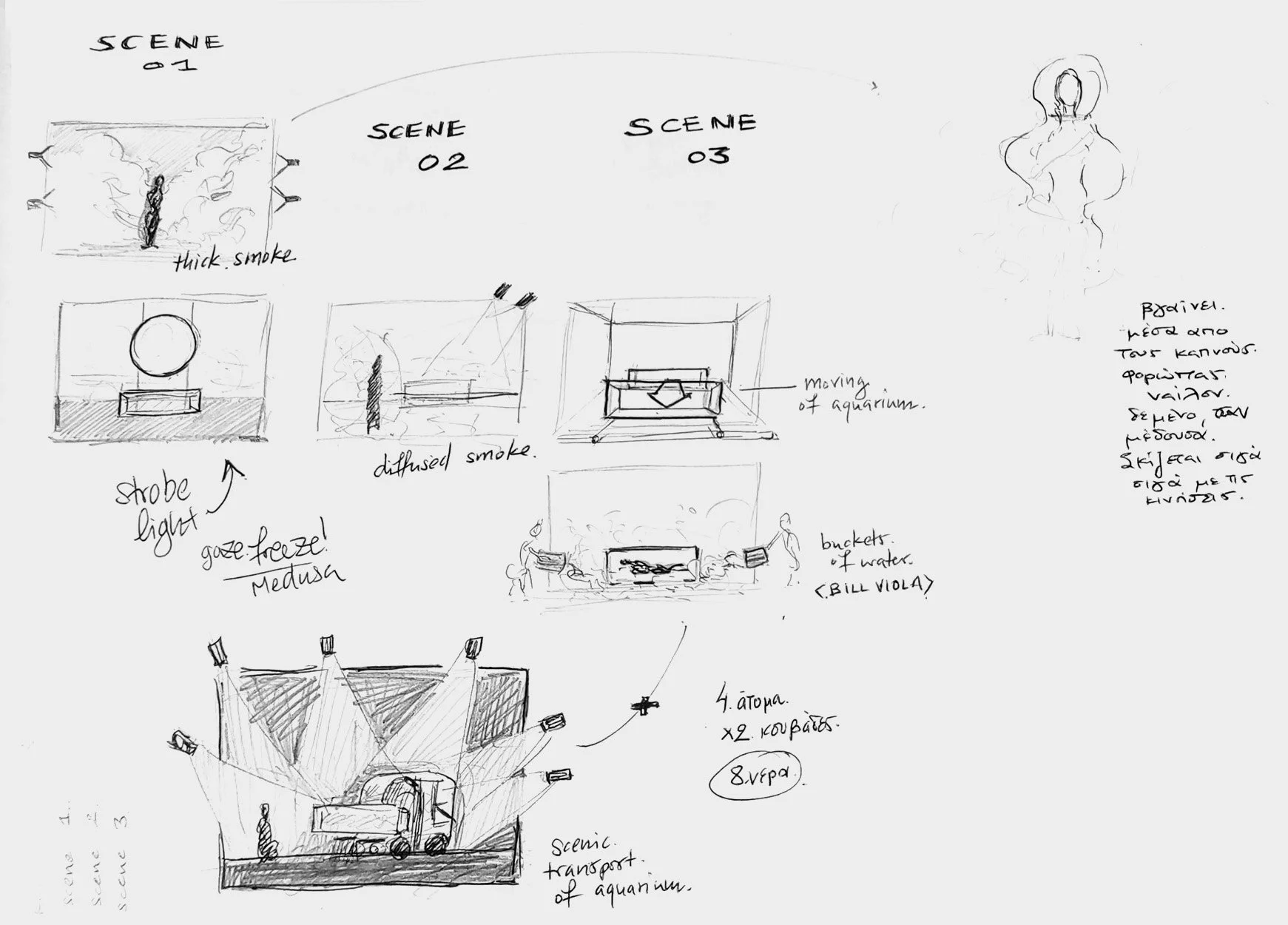 ABYSS is a 15-minute solo dance performance exploring how fear is experienced through the feminine body. Directed and choreographed by Sabina Andrea Allen and performed by Xenia Argyri, it weaves together the myth of Medusa, contemporary movement, and experimental sound. With stage and light design by Valia Lolidou, the performance is structured around a large aquarium that functions as the central scenic element. The scenography of ABYSS is based on the states of concealment and revelation, leading the audience along a path of successive transformations.