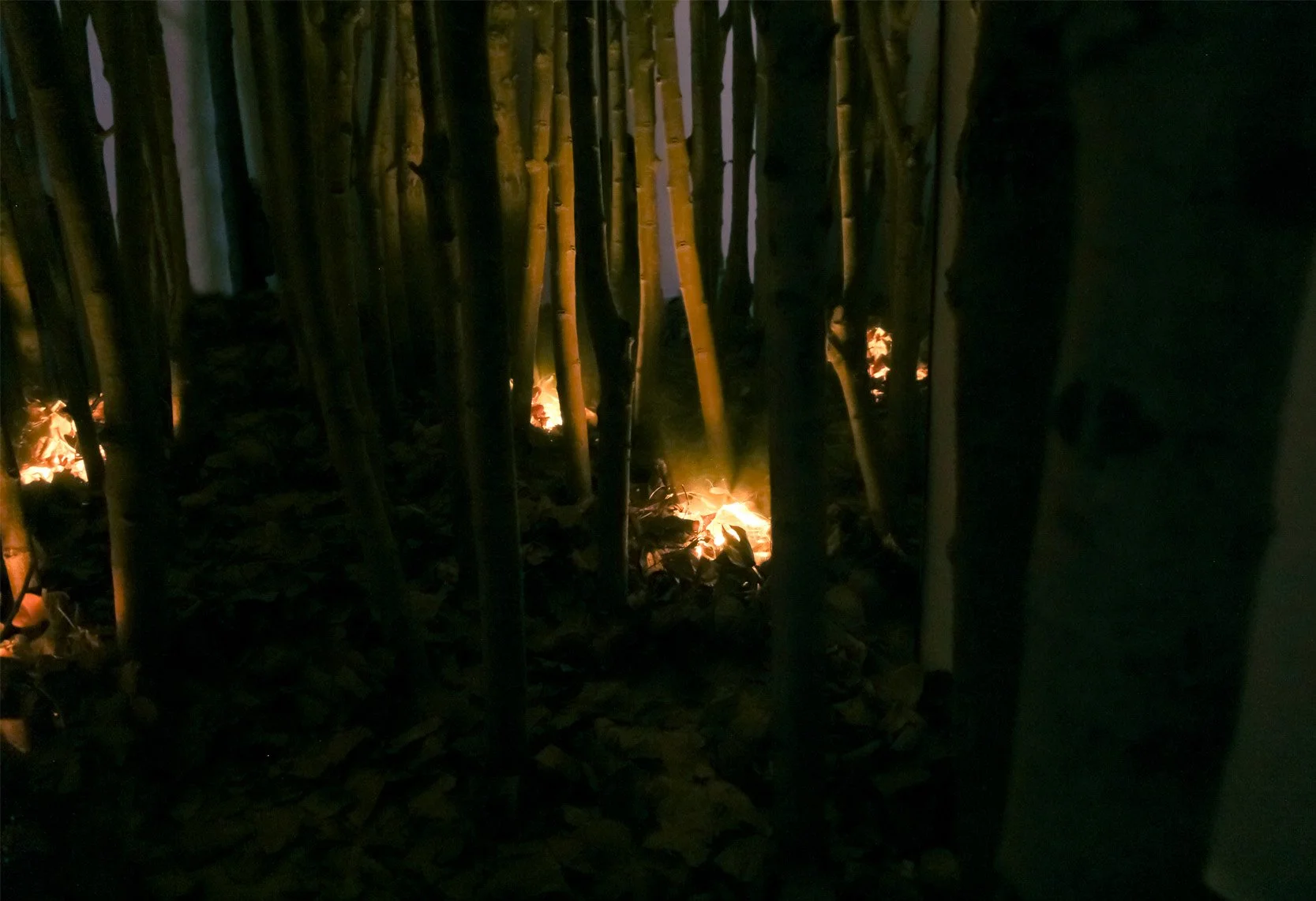 This installation was inspired by a vivid fever dream I once had. In my dream, I found myself in an endless forest, where only the trunks of enormous trees were illuminated by small fires. The fear of being trapped in the forest, combined with the dread of approaching flames, serves as a powerful motif for the installation.