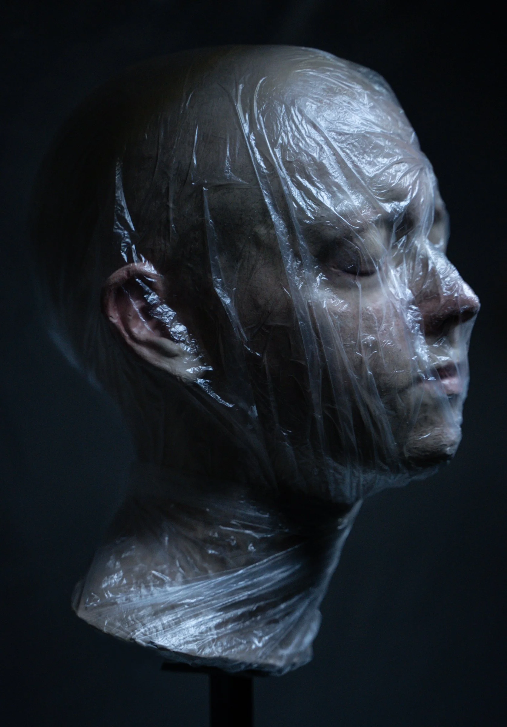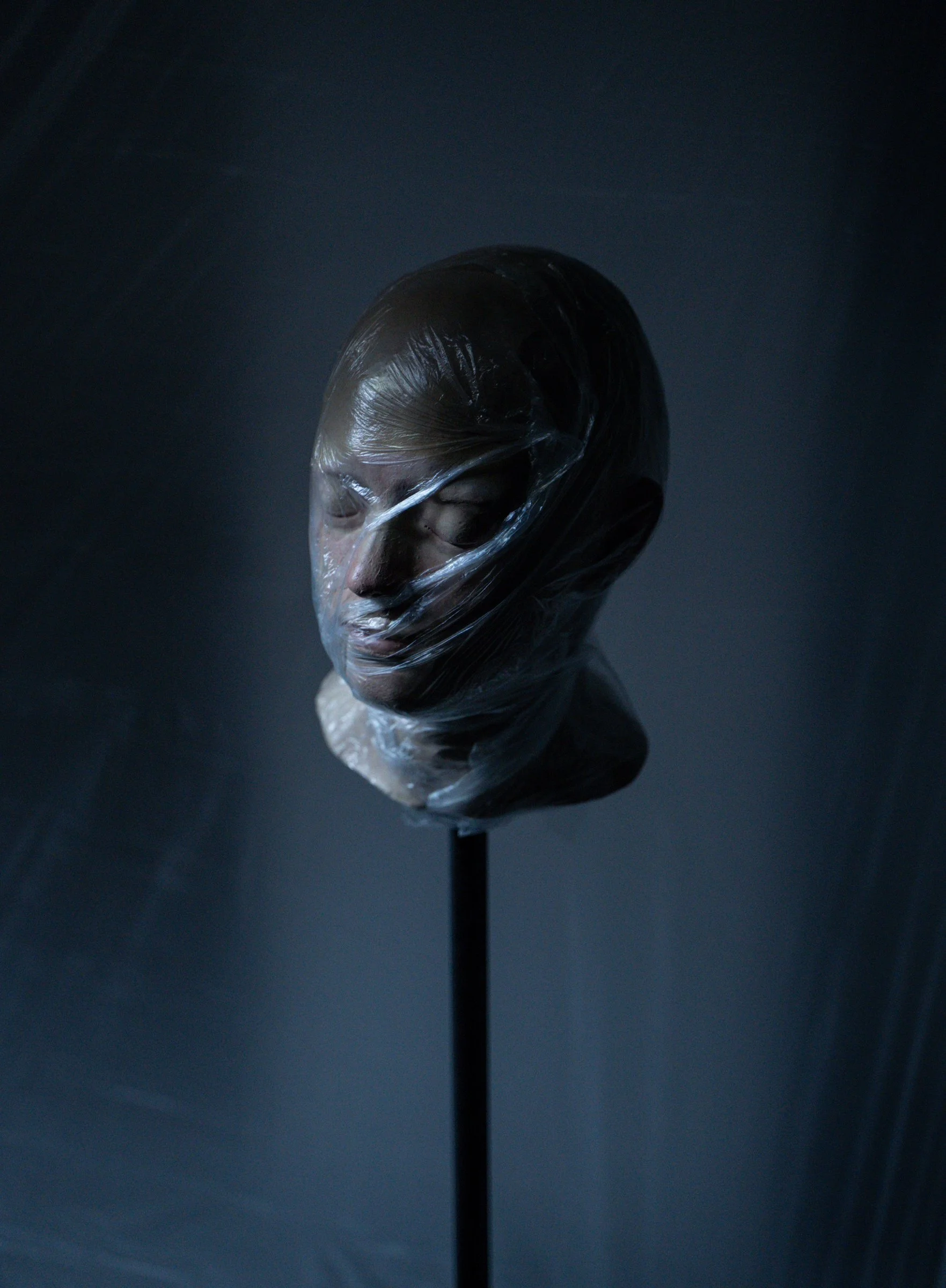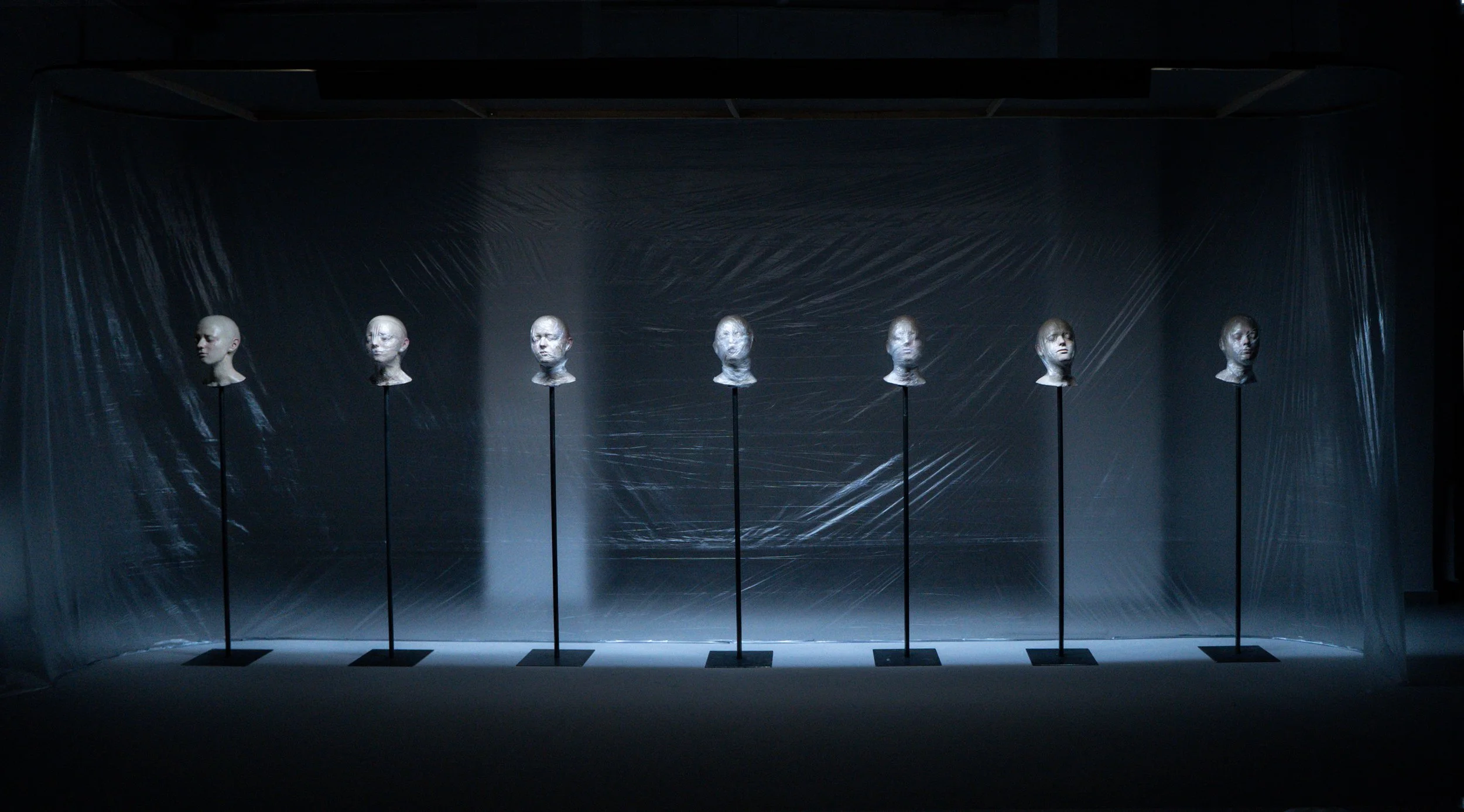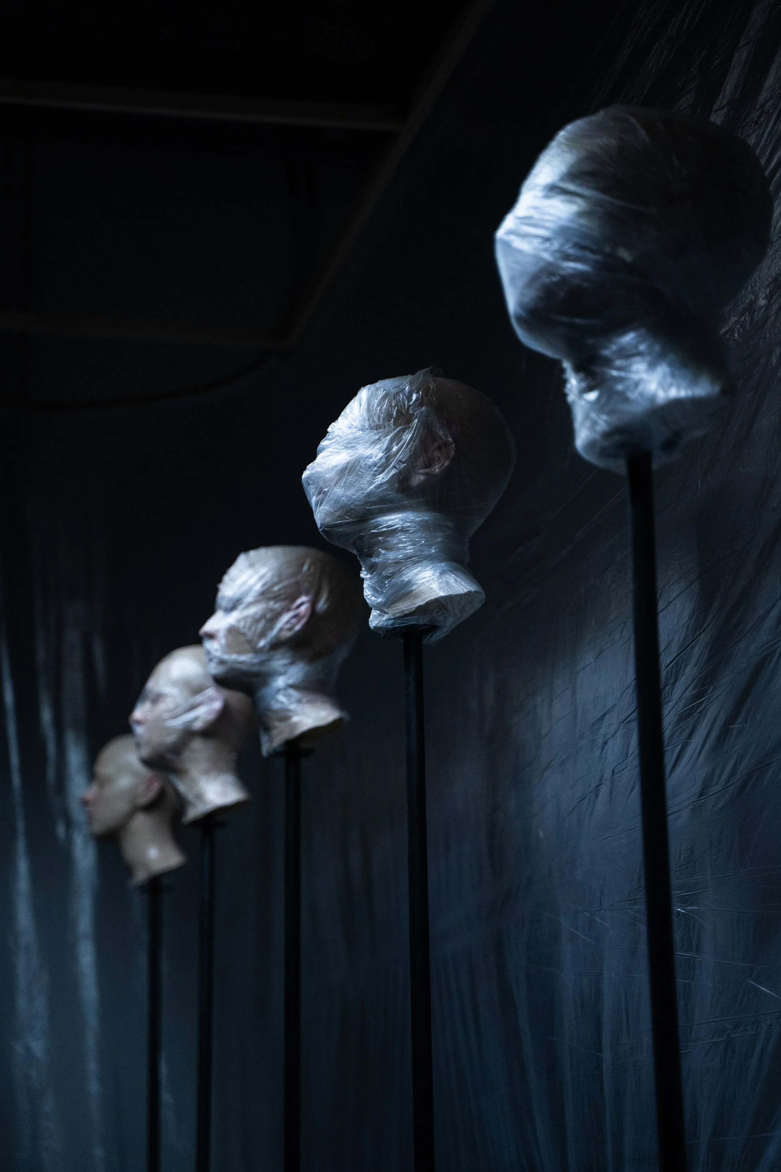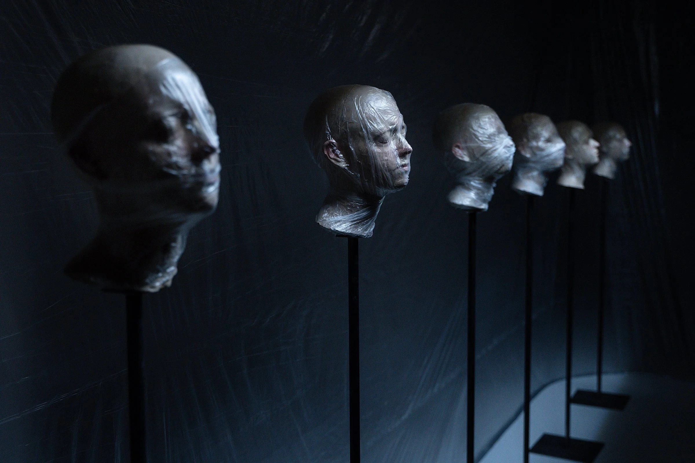 The installation Seven Heads consists of seven silicone heads mounted on metal rods. Partially veiled with nylon, the heads blur the line between human and artificial existence. The coldness of solitude is intensified by the repetition of the self, the creation of copies.
