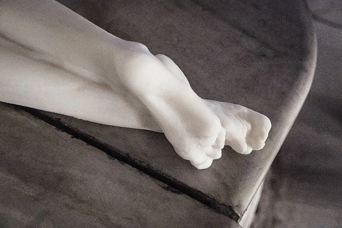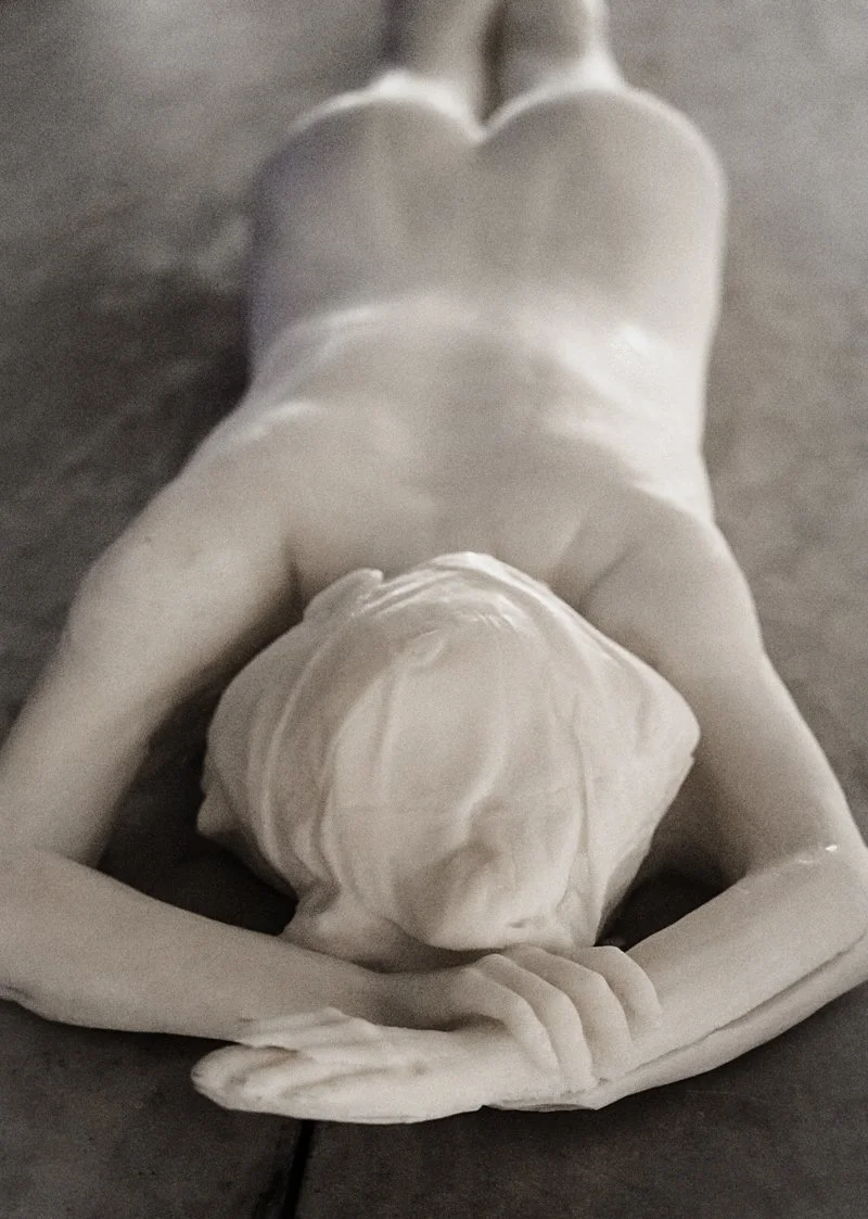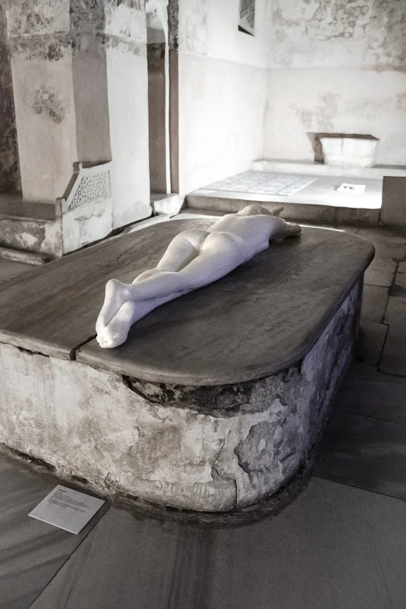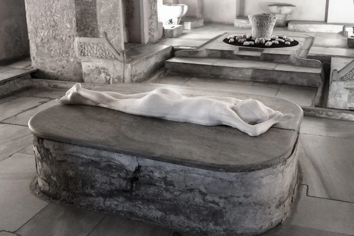 The effigy of a young woman in a relaxing position placed on the marble bench in the center of the "hot" hall of the Bey Hammam. Vasiliki made of soap, in an unexpected interaction with the space, sweats. Small droplets appear on the skin of the sculpture accelerating its deterioration, while at the same time underlining the ephemerality of a love touch, a memory, existence itself.